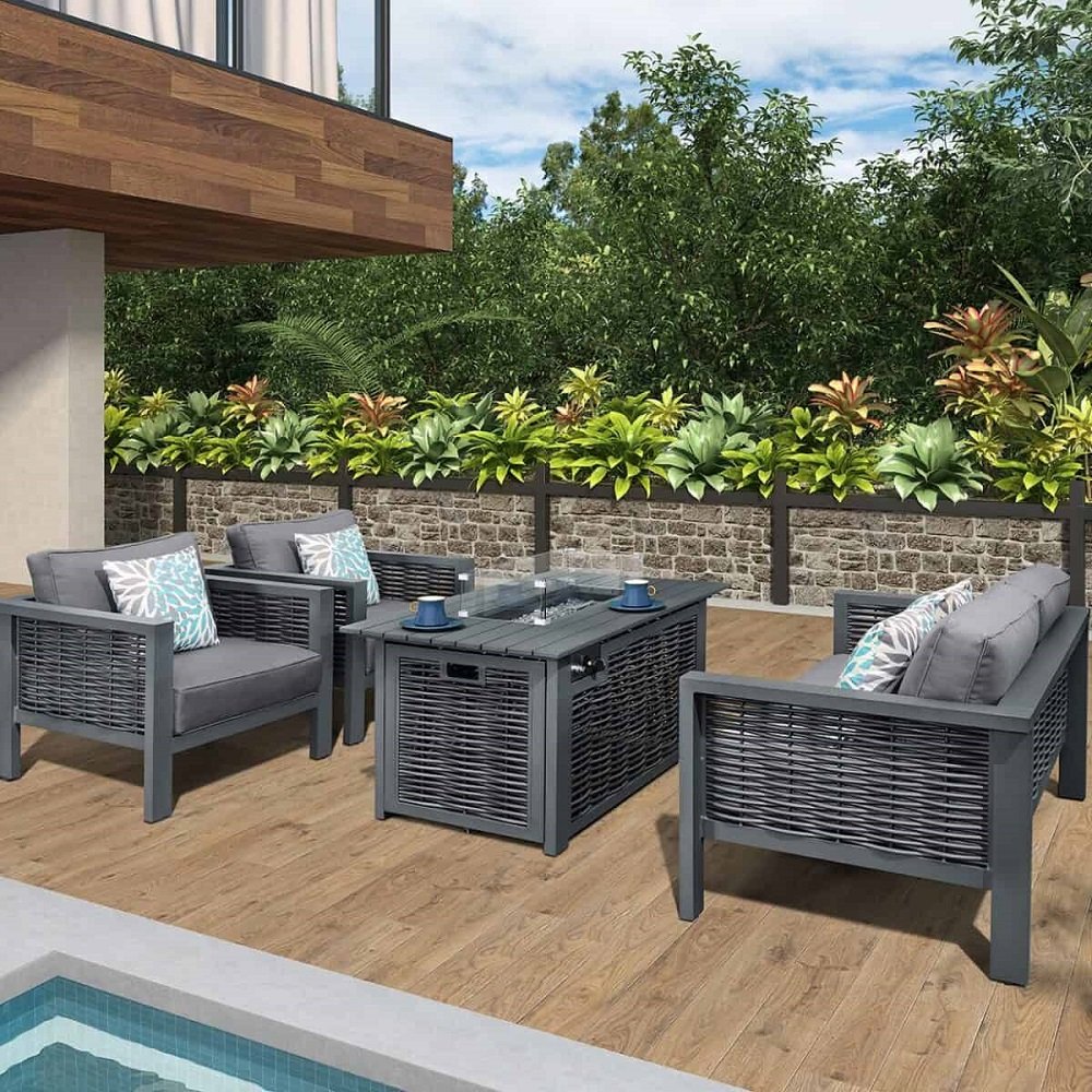 We have designed and built this garden sofa set with fire pit so it is completely safe for domestic use. This model has been certified and approved by the CSA and CA and comes with a 5mm thick shield of tempered glass to protect you from the flames. You can fill the pit with java rocks, glass beads, or a combination of both to create a stunning visual effect.